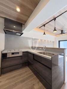 ダークグレーのグラデーションパネルで高級感が演出されたシステムキッチンです。