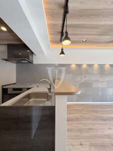 ワークトップから高さがあり、リビング側から手元を隠せる便利なカウンターが付いています。