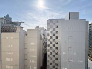 正面ビル非常階段の格子状パンチングパネルがアヴァンギャルドな、バルコニーからの眺望です。