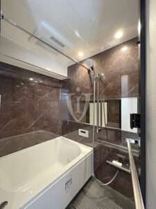 ブラウン天然石調グロスパネルがゴージャスな、ゆったり1216サイズのバスルームです。