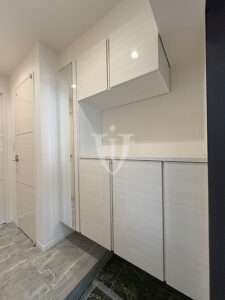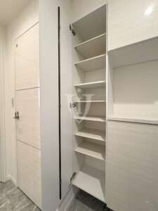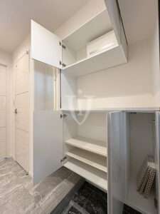 玄関扉側の天袋付き三列カウンターユニットの内部、花や置物など、お好きなデコレーションも楽しめそうです。
