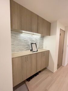 カウンター部分の壁にはアクセントタイルとダウンライトでおしゃれな仕上がりです。