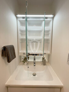 三面鏡タイプの鏡の裏側は収納になっています。