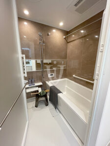 ブラウン天然石貼り調グロスパネルが素敵なくつろぎの空間を演出する、ゆったり1416サイズのバスルームです。