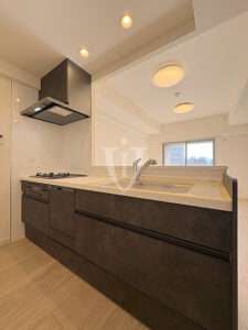 ダークグレーのむら染め調パネルで高級感が演出されたシステムキッチンです。