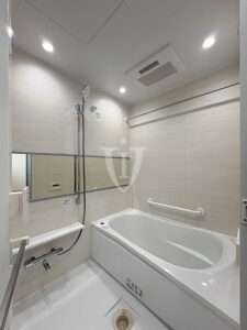 ホワイトウッド調パネルが素敵なくつろぎの空間を演出する、ゆったりサイズのバスルームです。