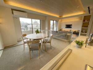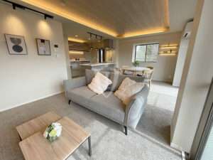 間接照明で演出された折り上げ天井、ウッド調アクセントクロスも素敵な仕上がりです。