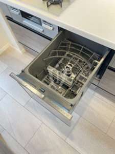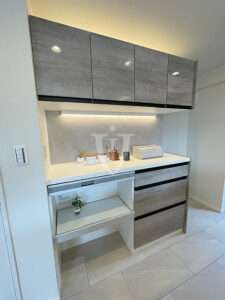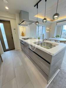 ウォルナット調パネルが落ち着きのある洗練された印象のシステムキッチンです。