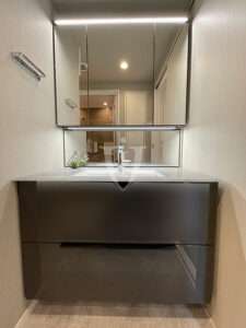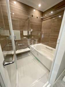 マホガニー調グロスパネルがゴージャスな、ゆったり1418サイズのバスルームです。