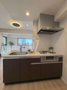 ダークブラウンパネルで高級感が演出されたシステムキッチンです。