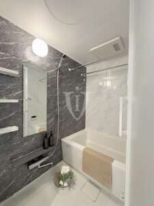 グレーとオフホワイトの石調パネルがゴージャスな、ゆったりサイズのバスルームです。