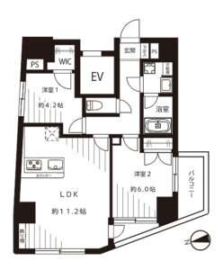 最上階となる12階南・西・北の三方角住戸で、陽当たり眺望良好の2LDKタイプです。