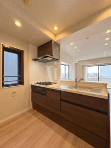 ウッド調パネルで高級感を演出するシステムキッチン、浄水器内蔵水栓を採用しています。