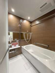 マホガニー調グロスパネルがゴージャスな、ゆったりサイズのバスルームです。