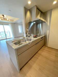ベージュのグラデーションパネルで高級感が演出されたシステムキッチンです。