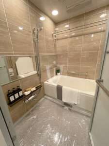 ベージュのグラデーションパネルが優しいくつろぎの空間を演出する、ゆったりサイズのバスルームです。