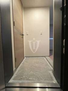 一面の天然石にダークウッド調桟、奥にはバックライトに照らされたガラスアートに、ささやかに主張する物件銘板。