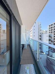 ウッドデッキ調タイルを敷き詰めた、ワイドスパンバルコニーです。