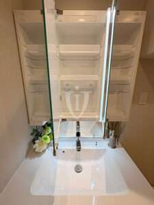 三面鏡タイプの鏡の裏側は収納になっています。