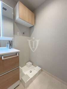 排水管の取り回しがしやすい高下駄式の防水パンを設置したランドリースペースです。