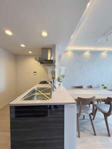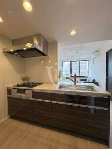 ダークブラウンパネルで高級感が演出されたシステムキッチンです。