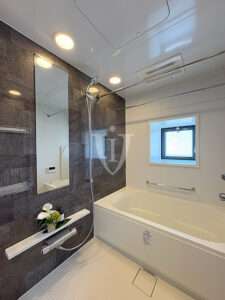 ダークブラウンの石調パネルがゴージャスな、ゆったりサイズのバスルームです。