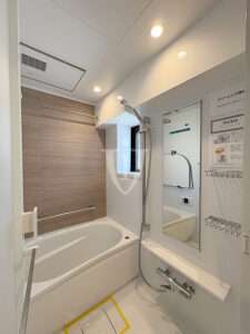 ベージュグラデーションアクセントパネルの質感が優しいくつろぎの空間を演出する、ゆったりサイズのバスルームです。