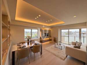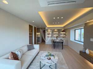 二面採光で明るく、間接照明で演出された折り上げ天井が素敵な約16.2帖の広々リビングです。