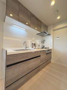 ウッド調パネルで高級感が演出されたシステムキッチンです。