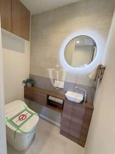 独立手洗い器と、間接照明でフロート感が演出されたサークルミラーも付いています。
