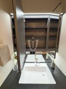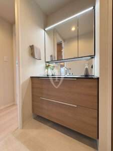 鏡の横には扉付きの可動棚収納が付いています。