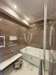 ウッド調パネルが優しいくつろぎの空間を演出する、ゆったりサイズのバスルームです。