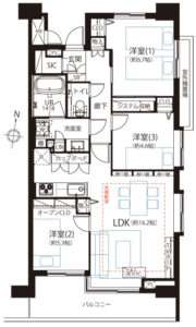 9階南東・北東の角住戸で陽当たり眺望良好、収納充実の3LDKタイプです。